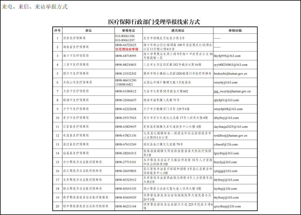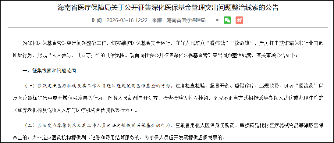 海南省医疗保障局关于公开征集深化医保基金管理突出问题整治线索的公告